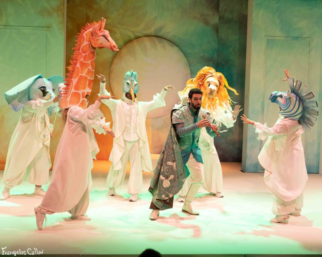 Μαζί τους ο Παπαγκένο, ένας χαριτωμένος παραμυθένιος ήρωας που με τις σκανδαλιές του θα χαρίσει στα παιδιά στιγμές χαράς και γέλιου. Το έργο τελειώνοντας βρίσκει τους δυο εχθρούς, βασίλισσα της νύχτας και βασιλιά της μέρας, ενωμένους. Το καλό θα νικήσει το κακό και θα απλωθεί σ’ όλη τη γη.