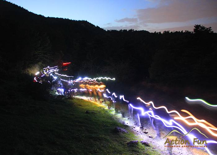 Η βραδινή πεζοπορία έχει μια δόση περιπέτειας, ενώ οι δεκάδες φακοί της παρέας μας ανάμεσα στα δέντρα, δημιουργούν μια μοναδική ατμόσφαιρα στο νυχτερινό τοπίο.